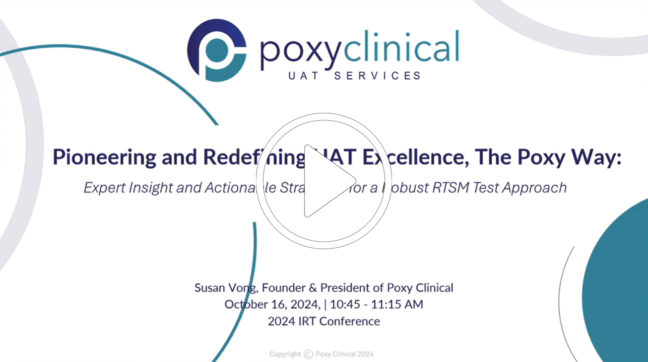Join industry expert Susan Vong for an insightful presentation on test strategies you can apply to your next User Acceptance Testing (UAT) process. Explore real-life scenarios of potential pitfalls and discover practical solutions to protect the three critical areas of RTSM: randomization, unblinding, and dosing. Learn about "The Poxy Way," a robust UAT methodology developed by Poxy Clinical, and see how it was successfully applied to accelerate timelines while ensuring quality across key cross-functional areas like Clinical Operations, Clinical Supplies, and Biostatistics.