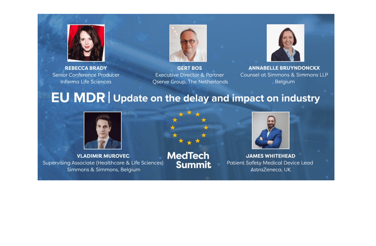 With confirmation of the EU MDR delay due to COVID-19, MedTech Summit brought together four industry insiders on 30 April 2020 to discuss the update and the impacts it will have on industry, featuring: Gert Bos, Executive Director & Partner at Qserve Group, The Netherlands, Annabelle Bruydonckx, Counsel at Simmons & Simmons LLP, Belgium, James Whitehead, Patient Safety Medical Device Lead at AstraZeneca, UK, and Vladimir Murovec, Supervising Associate (Healthcare & Life Sciences) at Simmons & Simmons, Belgium.